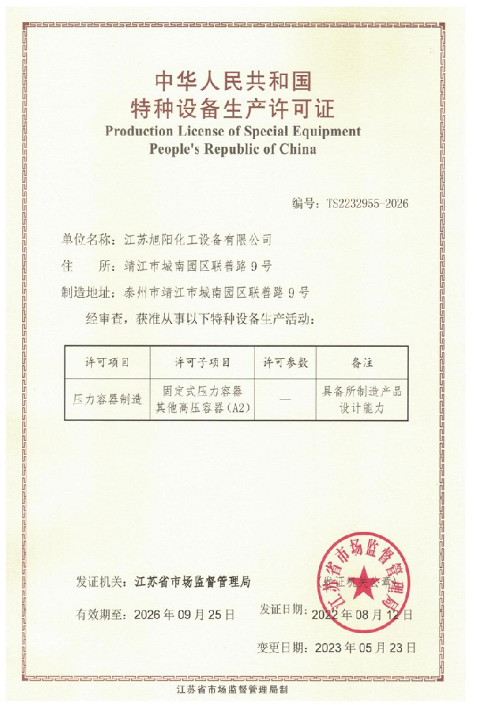 江蘇旭陽化工設(shè)備有限公司專業(yè)從事各類化工、環(huán)保、制藥、發(fā)酵、食品、新材料、鋰業(yè)等項目設(shè)計、制造及壓力容器的生產(chǎn)制造,是一家集研發(fā)、生產(chǎn)和進(jìn)出口貿(mào)易于一體的高科技企業(yè)。